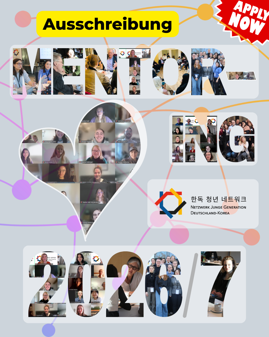 Das Netzwerk Junge Generation Deutschland-Korea startet im Jahr 2026 bereits zum sechsten Mal sein erfolgreiches Mentoring-Programm. Im Rahmen dieses zwölfmonatigen Programms bringen wir für eine gewisse Zeit die ausgewählten Mentees in Tandems mit erfahrenen Mentorinnen und Mentoren aus dem Umfeld der deutsch-koreanischen Beziehungen zusammen.