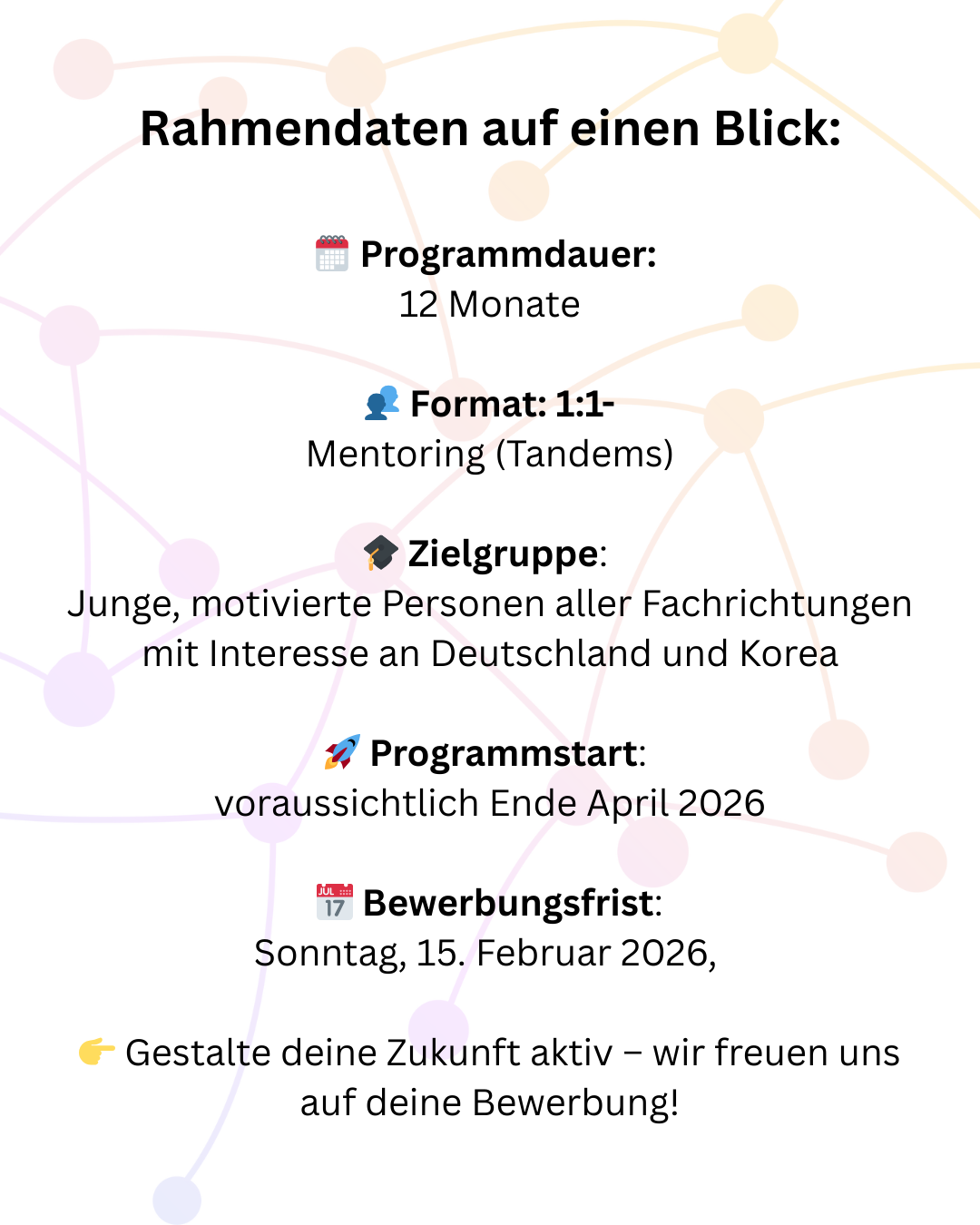 Wir laden junge, motivierte Personen aller Fachrichtungen mit Interesse an der deutsch-koreanischen Beziehung ein, sich bis zum Sonntag den 15. Februar 2026 um 23:59 Uhr über unser Google-Formular (https://forms.gle/whW2fPmBdbn3oJtN8) zu bewerben. Rückmeldungen zu den Bewerbungen werden bis voraussichtlich Ende März verschickt. Erfolgreiche Kandidat:innen erhalten anschließend weitere Informationen zum Ablauf. Unser Mentoring-Programm startet dann voraussichtliche Ende April 2026 in die neue Runde.
