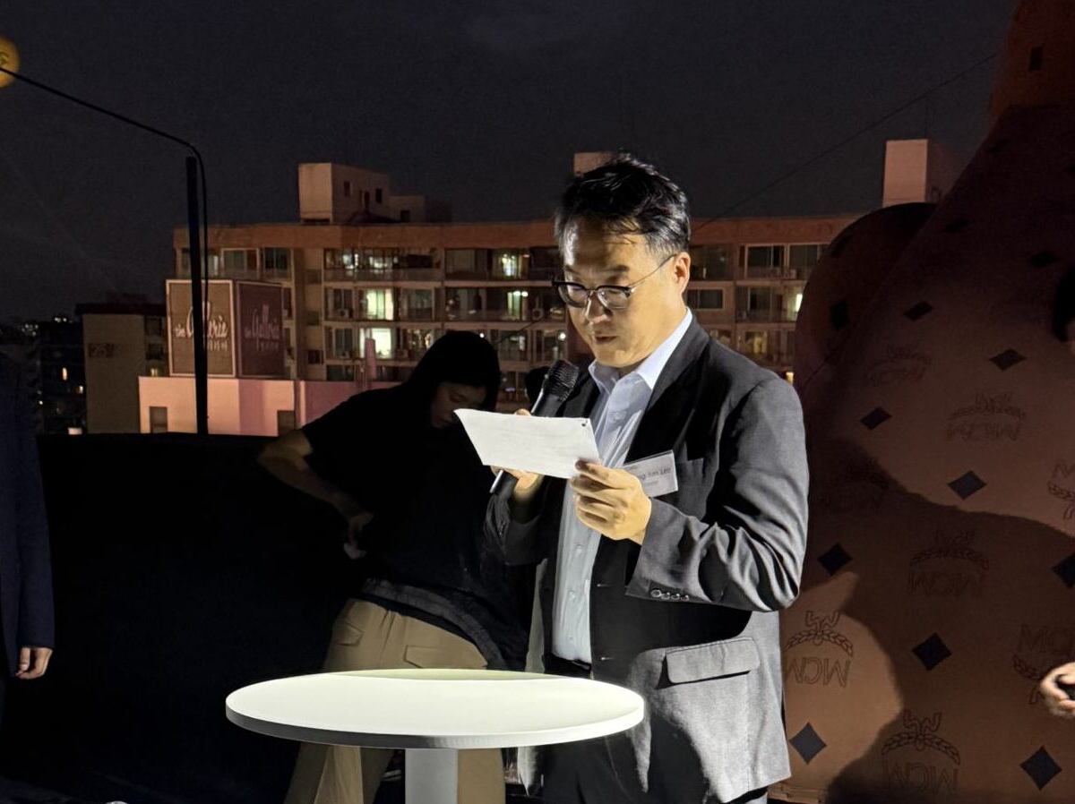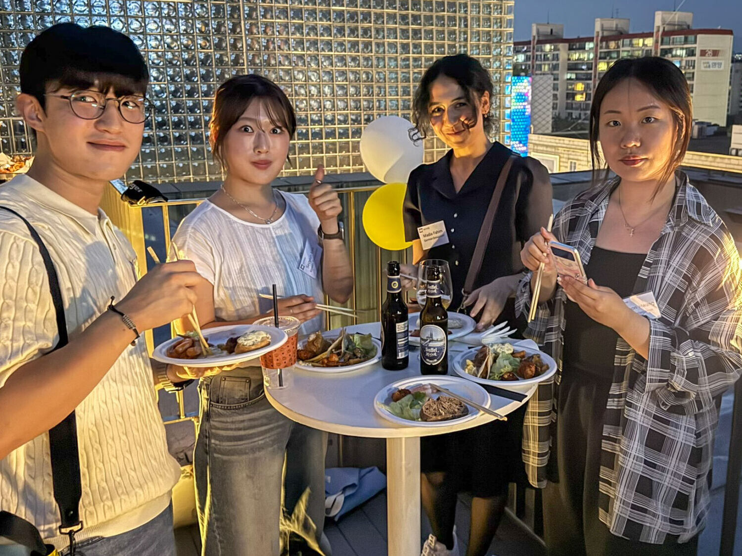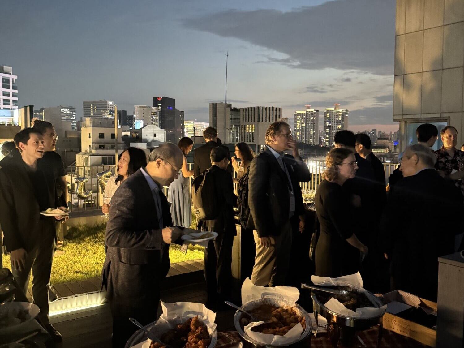 Als letzter Termin eines ereignisreichen ersten Tages stand die Willkommensfeier der deutschen und koreanischen Delegation des Juniorforums auf dem Programm. Das Alumninetzwerk Deutschland Korea (ADeKo) lud dazu zu einem Empfang alle Teilnehmer:innen des Juniorforums, Mentor:innen der Arbeitsgruppen, Verteter:innen der Deutsch-Koreanischen Gesellschaft (e.V.), Mitglieder des ADeKo Vorstands, Verteter:innen des DAAD und der deutschen Botschaft in Seoul ein. Mit einer kleinen Verspätung, aber voller Vorfreude endlich unsere koreanischen Gruppenmitglieder und Mentor:innen persönlich kennenzulernen, trafen wir im MCM-Haus in Gangnam ein. Die Location war gut gewählt – quasi ein kleiner Teil Deutschlands in Korea. Im Keller des Hauses befindet sich das Café BrotArt, welches Brezeln nach deutschem Backhandwerk verkauft. Im Erdgeschoss ist der Ladenbereich von MCM, ein Designerlabel aus München und darüber eine Kunstgalerie. Schließlich gibt es ganz oben noch die Dachterrasse mit toller Aussicht über die Stadt.