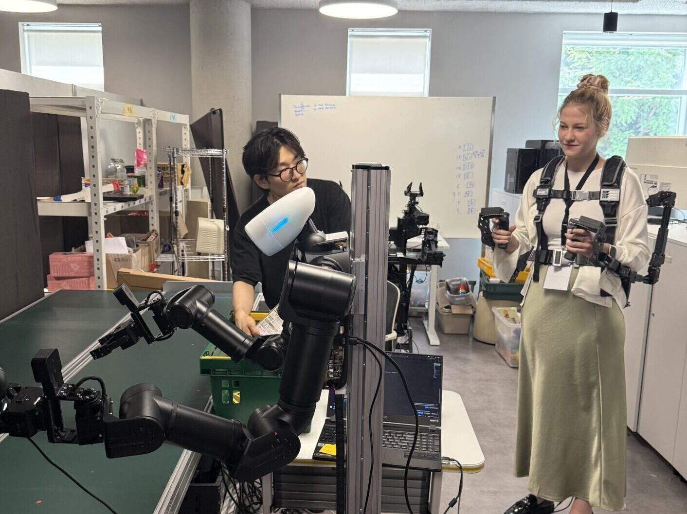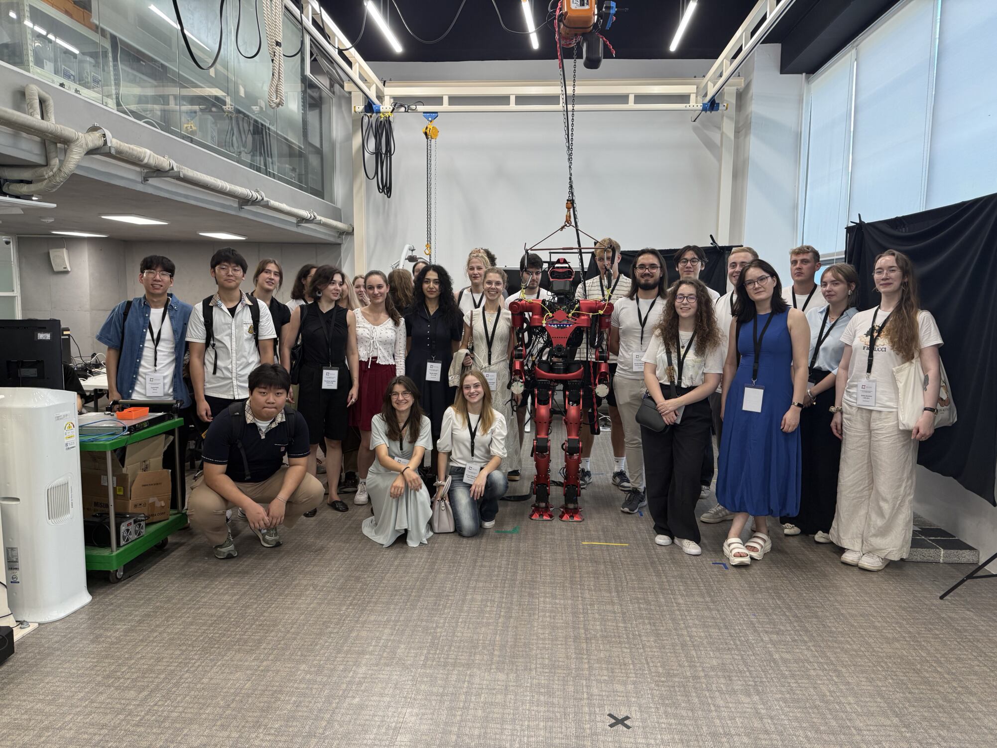 Im Anschluss daran führte man uns auf die Dachterrasse des Gebäudes, von wo aus wir einen beeindruckenden Blick über den Campus und die Stadt Seoul hatten. Danach besuchten wir das studentische KI-Labor. Dort durften wir eine Demonstration eines kleinen „Kassierroboters“ erleben. Der Roboter wurde darauf trainiert, eine Currybox vom Kassenband zu nehmen und in einen Einkaufskorb zu legen. Das war nicht nur spannend, sondern auch unterhaltsam anzuschauen. Besonders begeistert waren wir, als eine von uns sogar selbst ausprobieren durfte, den Roboter über ein Exoskelett mit Sensoren zu trainieren. Für mich war das einer der Höhepunkte des Besuchs, da man so direkt sehen konnte, wie die Verbindung zwischen menschlichen Bewegungen und KI-gesteuerter Robotik funktioniert. In diesem Zusammenhang wurde uns erklärt, dass ein großes Problem bei der Entwicklung von Robotern ist, dass sie im Gegensatz zu Sprachmodellen wie ChatGPT auf physische Trainingsdaten angewiesen sind. Das bedeutet, dass man Roboter mühsam durch reale Interaktionen trainieren muss, was den Fortschritt deutlich verlangsamt. Für uns war das eine wertvolle Erkenntnis, die noch einmal verdeutlichte, wie groß die Herausforderungen in der Entwicklung von KI gesteuerter Robotik sind.